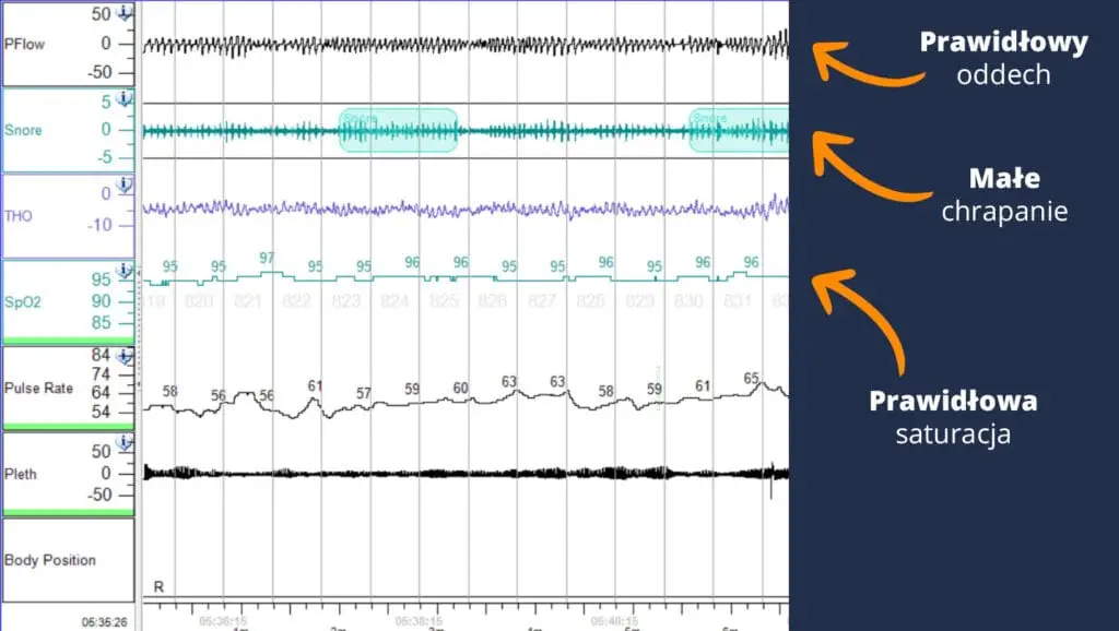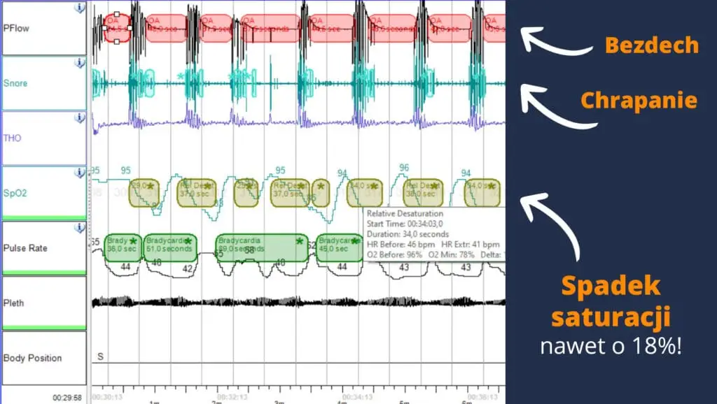 - Pozycja ciała – pozwala ocenić, czy bezdechy występują częściej w określonych pozycjach snu.